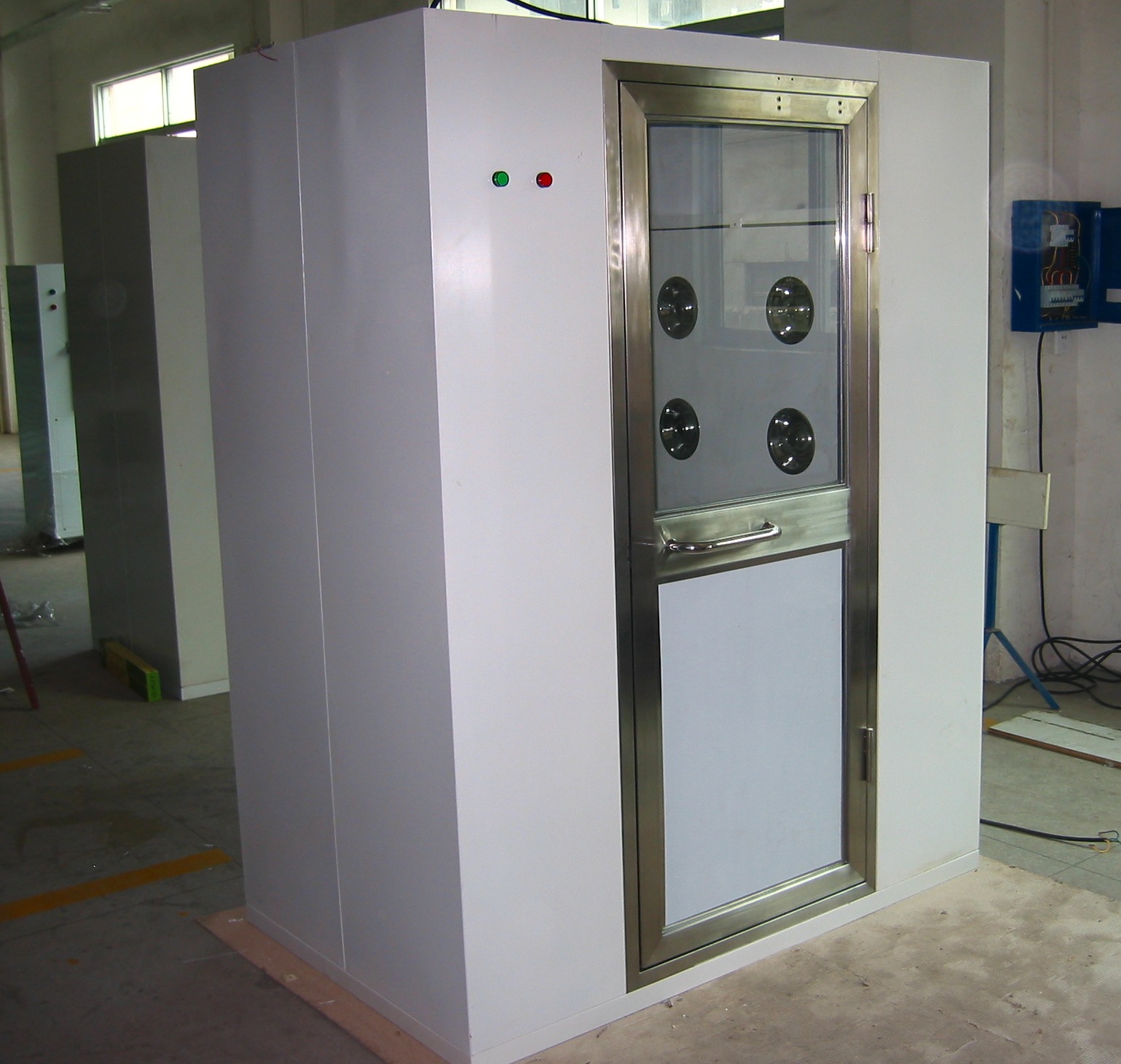 ■急停開(kāi)關(guān):在風(fēng)淋室出現(xiàn)故障的情況下,能立即切斷電源,使風(fēng)淋室所有的門處于打開(kāi)狀態(tài)。